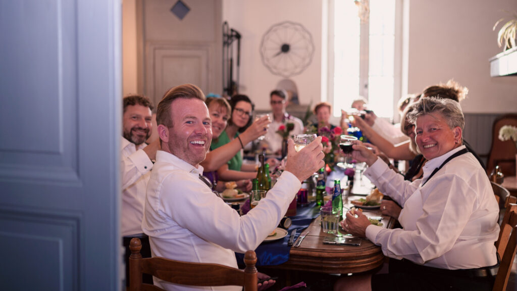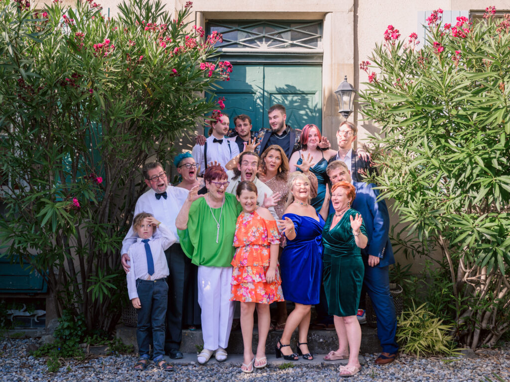 Une fois les photos de l’intérieur réalisées, j’ai rejoint la joyeuse bande d’invités. Quelques photos de groupe, beaucoup de rires… puis je me suis laissée porter par l’ambiance pour capturer des images sur le vif, celles que je préfère, pleines de vie et d’émotions sincères.